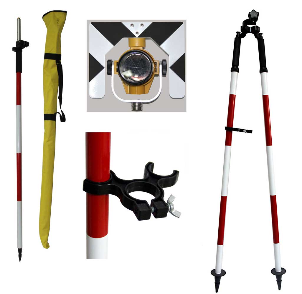 Полный комплект для тахеометрической съемки. Состоит из вехи, бипода, отражательного комплекта с призмой. Веха выполнена из 2-х телескопических секций, фиксация секций - винтовой зажим. На вешке установлен круглый уровень. Высота - 250мм. Бипод - алюминиевый. Крепление вехи к биподу - типа "струбцина". Крепление отражателя: адаптер 5/8" и LEICA адаптер. Константа призмы отражателя - минус 30мм. Вес комплекта - 3,0 кг. Чехол для переноски бипода с вехой, мягкая сумка - для переноски отражателя.